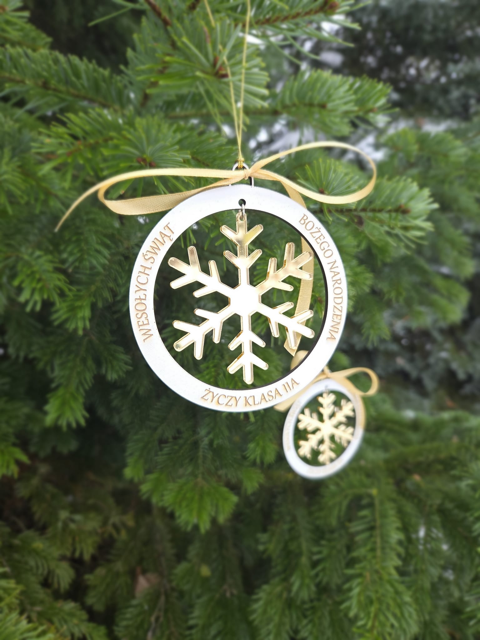 Bombka z białej sklejki z piękna złotą lustrzaną śnieżynką