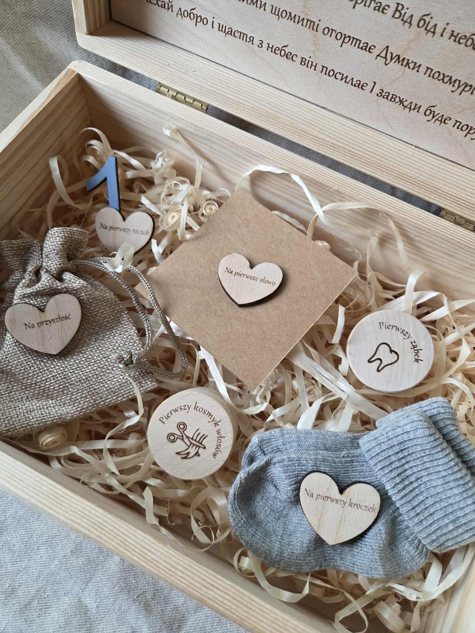 W pudełku znajdziesz kółeczeka z wybranymi napisami oraz pudełko na pierwszy ząbek lub pierwszy kosmyk włosów.