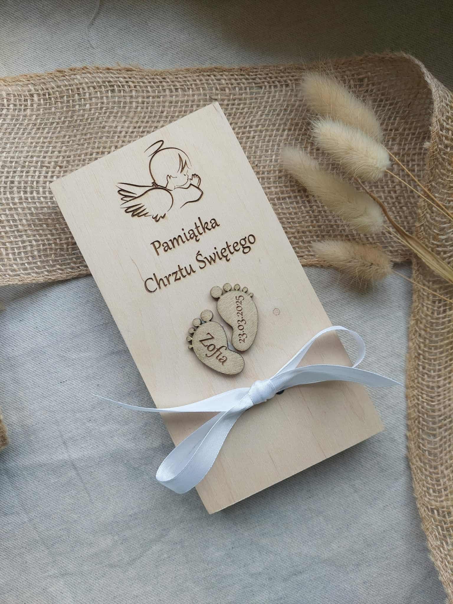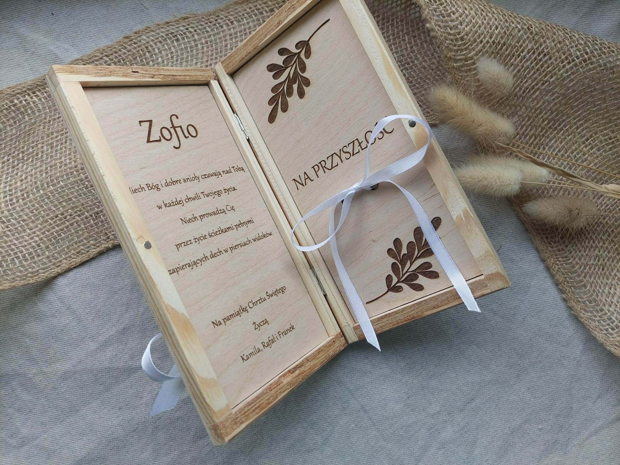 Pudełko na banknoty to elegancka pamiątka Chrztu Świętego. Wykonana jest z