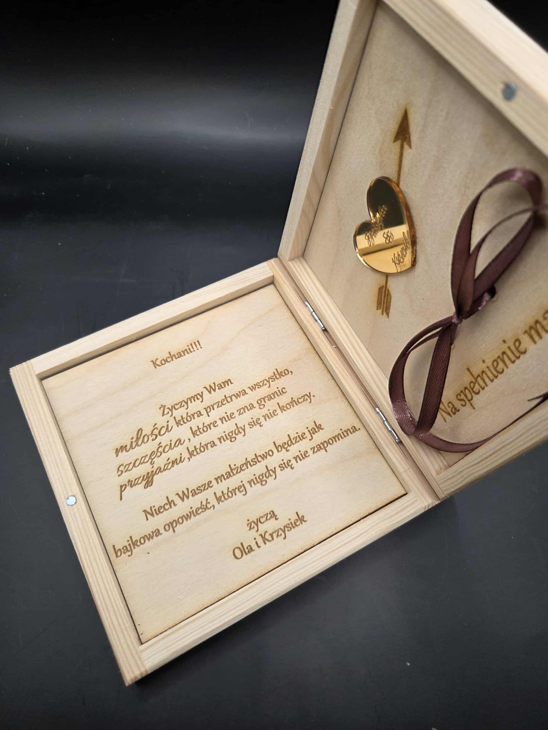 Pudełko na banknoty to elegancka pamiątka ślubu. Wykonana jest z naturalnego, jasnego drewna.