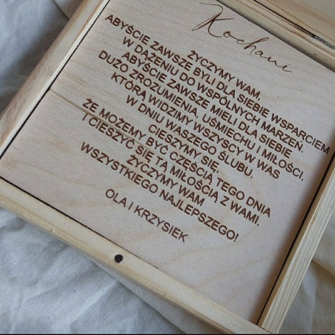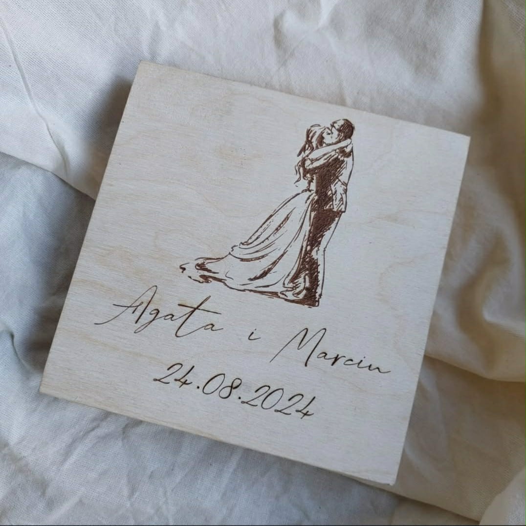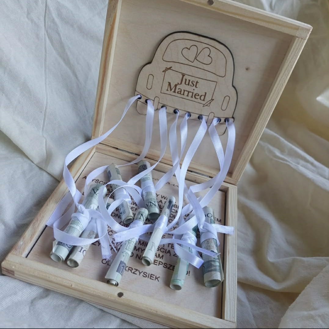Pudełko na banknoty to elegancka pamiątka ślubu. Wykonana jest z naturalnego, jasnego drewna.