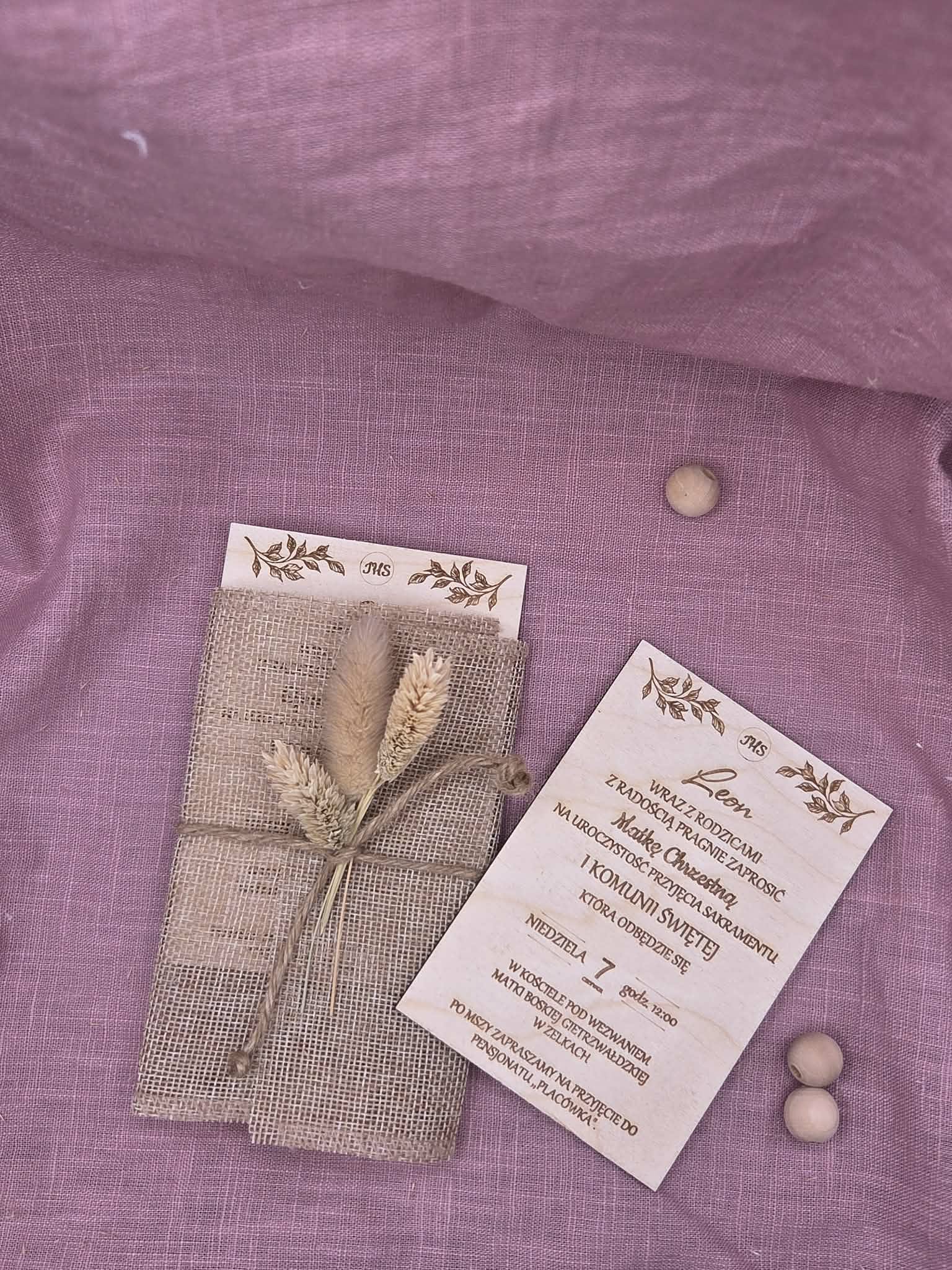 Drewniane, eleganckie zaproszenie na Komunię Świętą